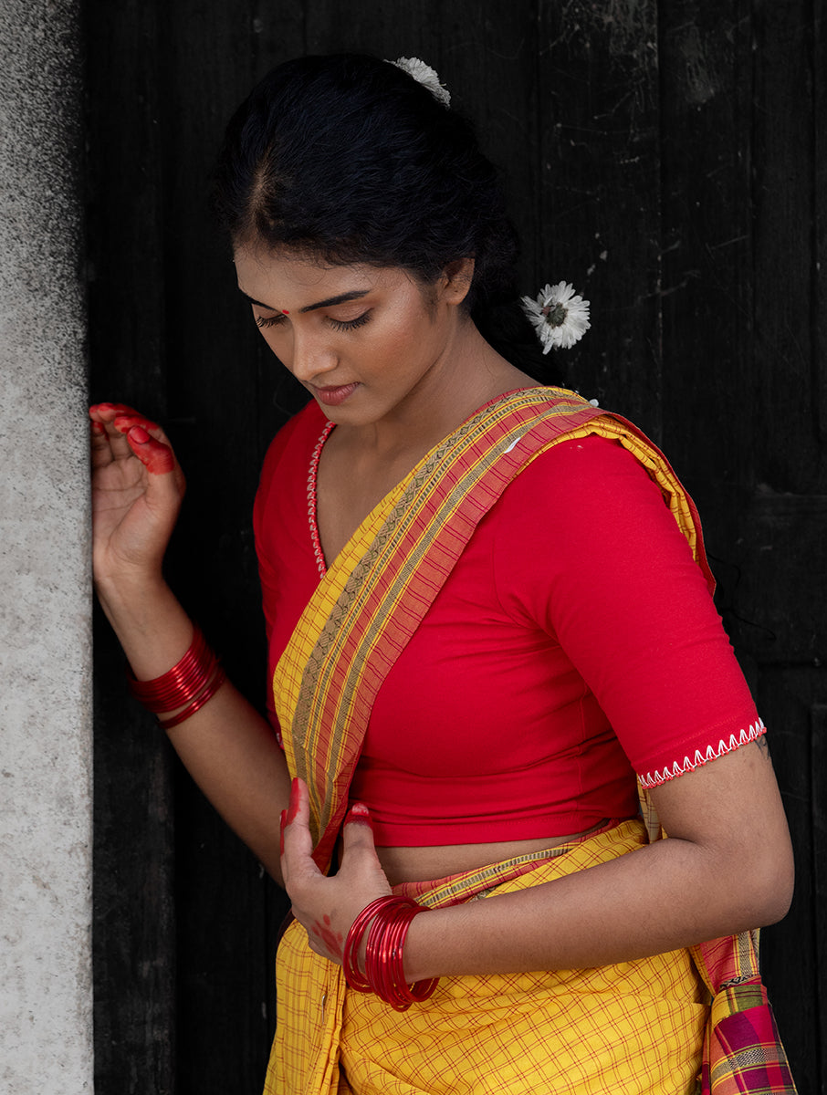 Made with 4-way stretch (up to 8") cotton, this blouse molds to your form with ease, offering breathable comfort for daily wear or styled occasions. The round neckline and elbow-length sleeves give it a refined edge, making it ideal to pair with sarees, skirts, or relaxed layers.